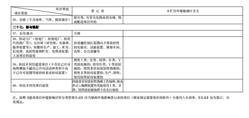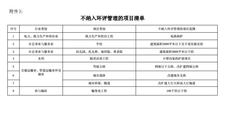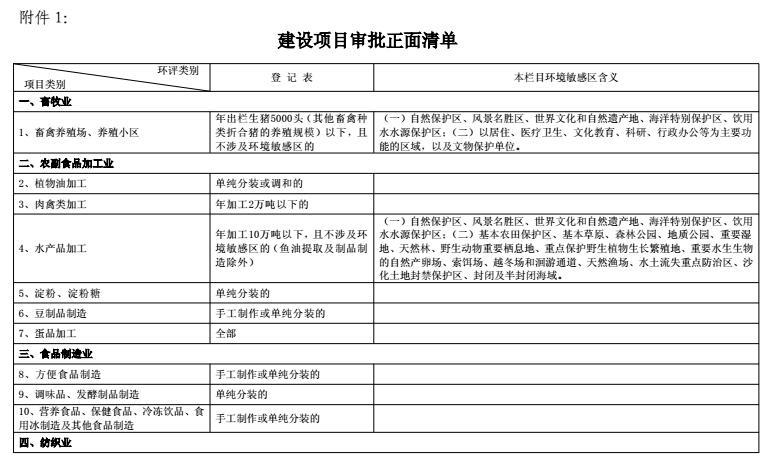 ? ? 對列入負面清單的項目(見附件 2),不得建設,各級環(huán)保部門不得審批其環(huán)評文件。不納入環(huán)評管理的項目無需進行環(huán)評(見附件3)。對其他項目,簡化審批程序。