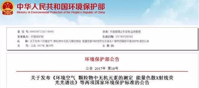 今年5月份,國(guó)家環(huán)境保護(hù)部批準(zhǔn)了《環(huán)境空氣 顆粒物中無機(jī)元素的測(cè)定 能量色散X射線熒光光譜法》(HJ 829-2017)和《環(huán)境空氣 顆粒物中無機(jī)元素的測(cè)定 波長(zhǎng)色散X射線熒光光譜法》(HJ830-2017)兩項(xiàng)標(biāo)準(zhǔn)為國(guó)家環(huán)境保護(hù)標(biāo)準(zhǔn),予以發(fā)布。