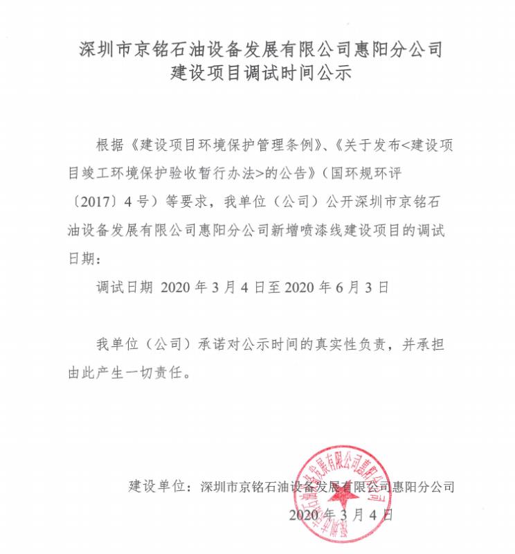 深圳市京銘石油設(shè)備發(fā)展有限公司惠陽分公司建設(shè)項目調(diào)試時間公示