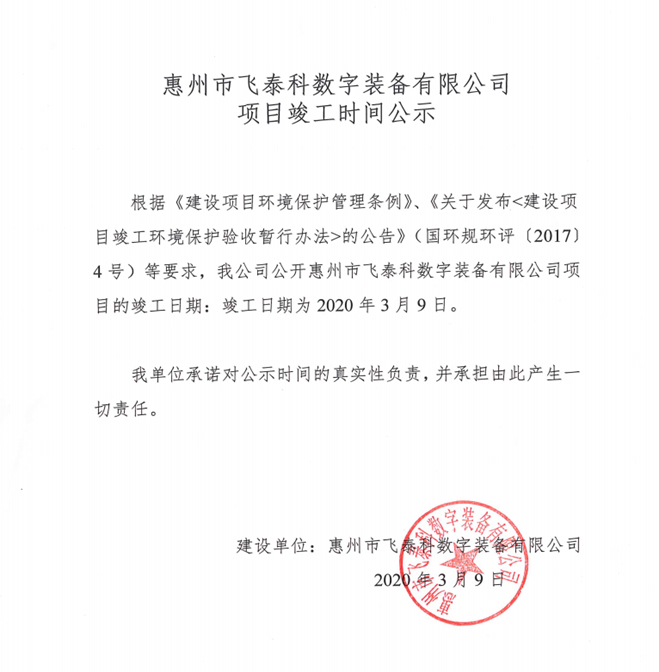 惠州市飛泰科數(shù)字裝備有限公司項目竣工時間公示