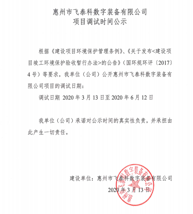惠州市飛泰科數(shù)字裝備有限公司項目調(diào)試時間公示