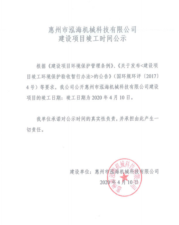 惠州市泓海機械科技有限公司建設(shè)項目竣工時間公示