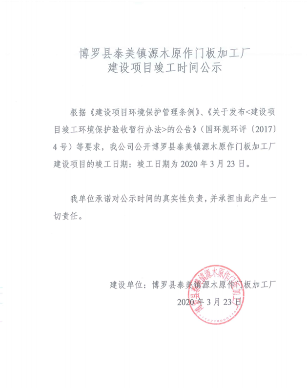 博羅縣泰美鎮(zhèn)源木原作門板加工廠建設(shè)項目竣工時間公示