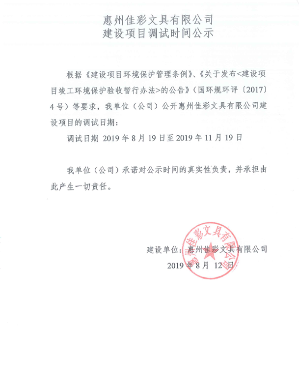 惠州佳彩文具有限公司建設(shè)項(xiàng)目竣工環(huán)境保護(hù)驗(yàn)收?qǐng)?bào)告公示