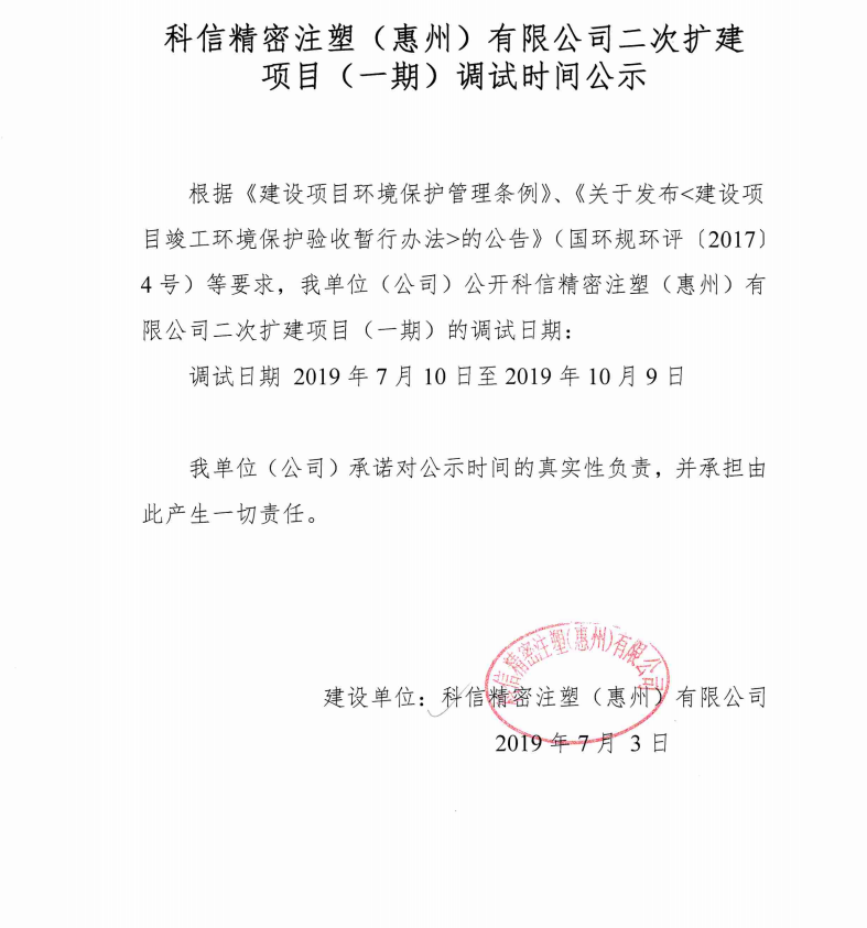 科信精密注塑(惠州)有限公司二次擴(kuò)建項(xiàng)目(一期)建設(shè)項(xiàng)目竣工環(huán)境保護(hù)驗(yàn)收?qǐng)?bào)告公示