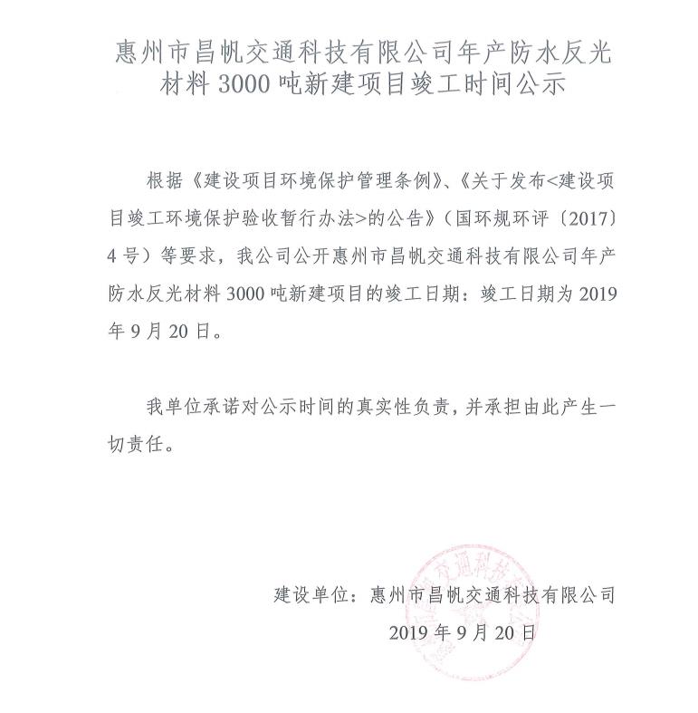 惠州市昌帆交通科技有限公司年產(chǎn)防水反光材料3000噸新建項(xiàng)目竣工時(shí)間公示