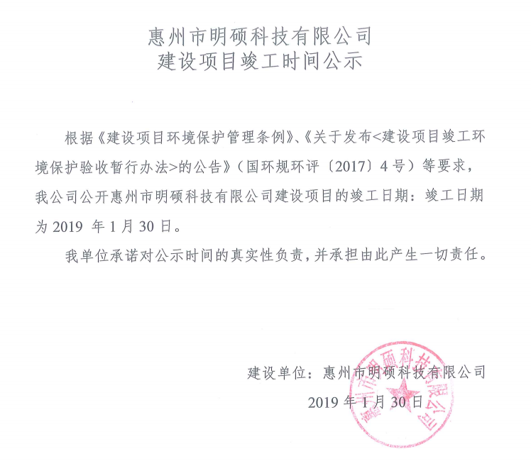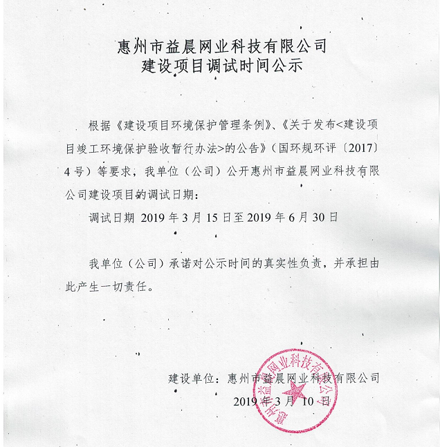 惠州市益晨網(wǎng)業(yè)科技有限公司建設(shè)項目竣工時間公示
