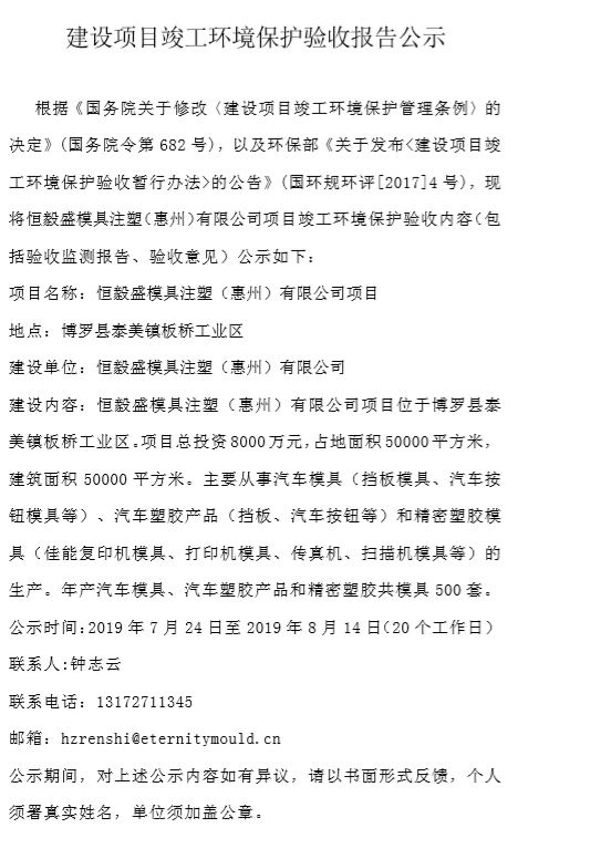 恒毅盛模具注塑(惠州)有限公司建設(shè)項目竣工環(huán)境保護驗收報告公示
