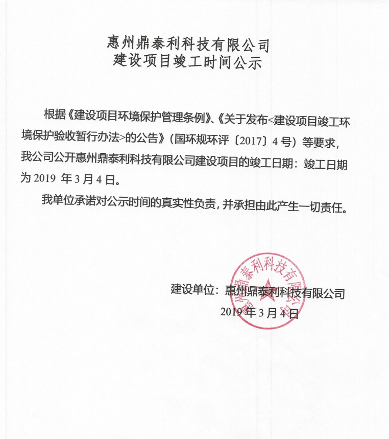 惠州鼎泰利科技有限公司 建設(shè)項(xiàng)目竣工環(huán)境保護(hù)驗(yàn)收?qǐng)?bào)告公示