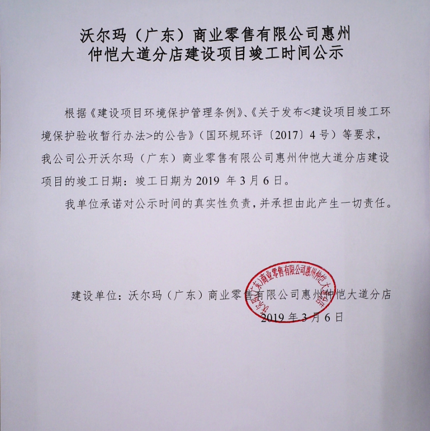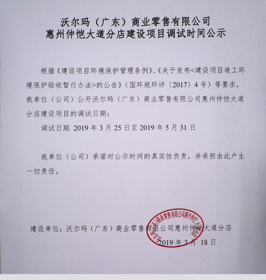當(dāng)前位置:首頁(yè) ? 驗(yàn)收公示 沃爾瑪(廣東)商業(yè)零售有限公司惠州仲愷大道分店 建設(shè)項(xiàng)目竣工環(huán)境保護(hù)驗(yàn)收?qǐng)?bào)告公示