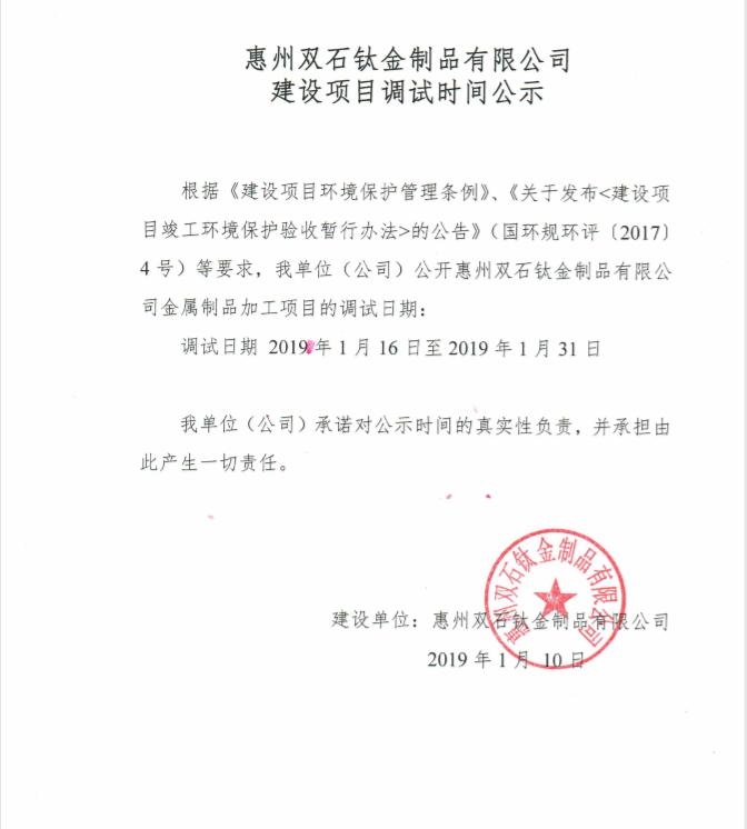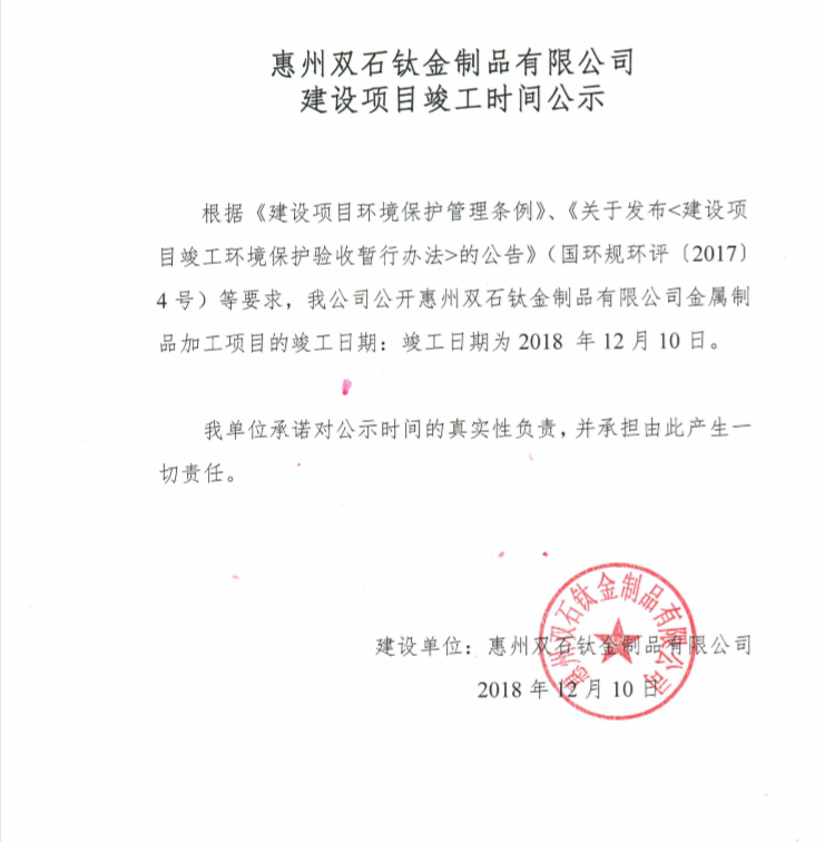 惠州市雙石鈦金制品有限公司建設(shè)項目竣工環(huán)境保護驗收報告公示