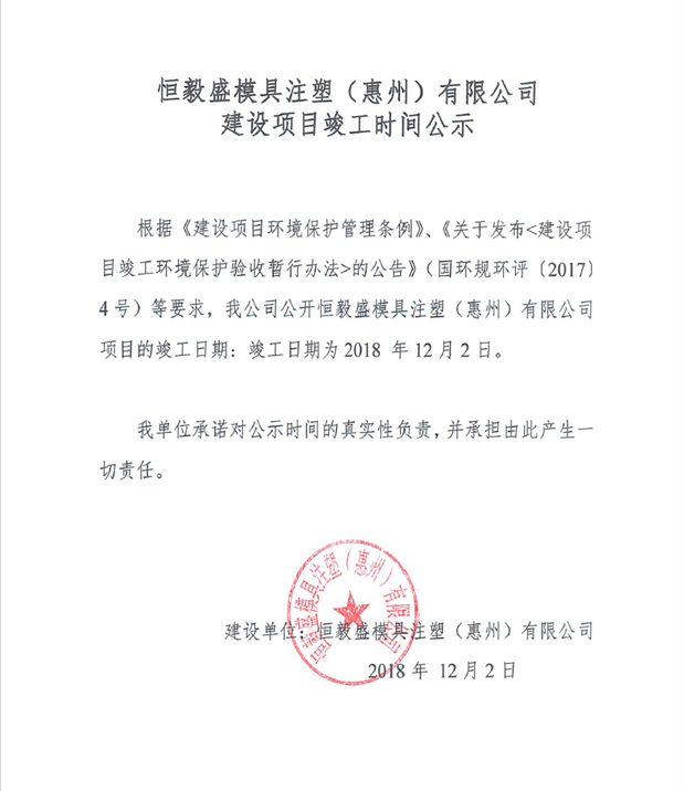 恒毅盛模具注塑(惠州)有限公司項目竣工環(huán)境保護驗收報告公示