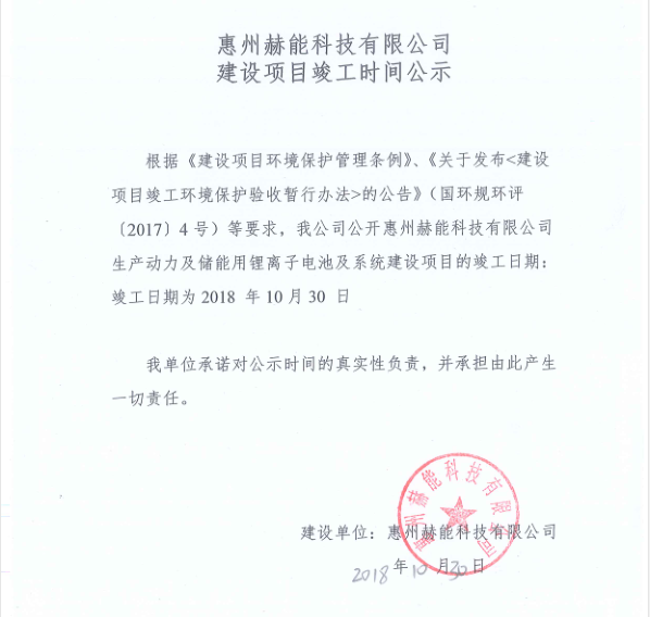 惠州赫能科技有限公司建設(shè)項目竣工時間公示