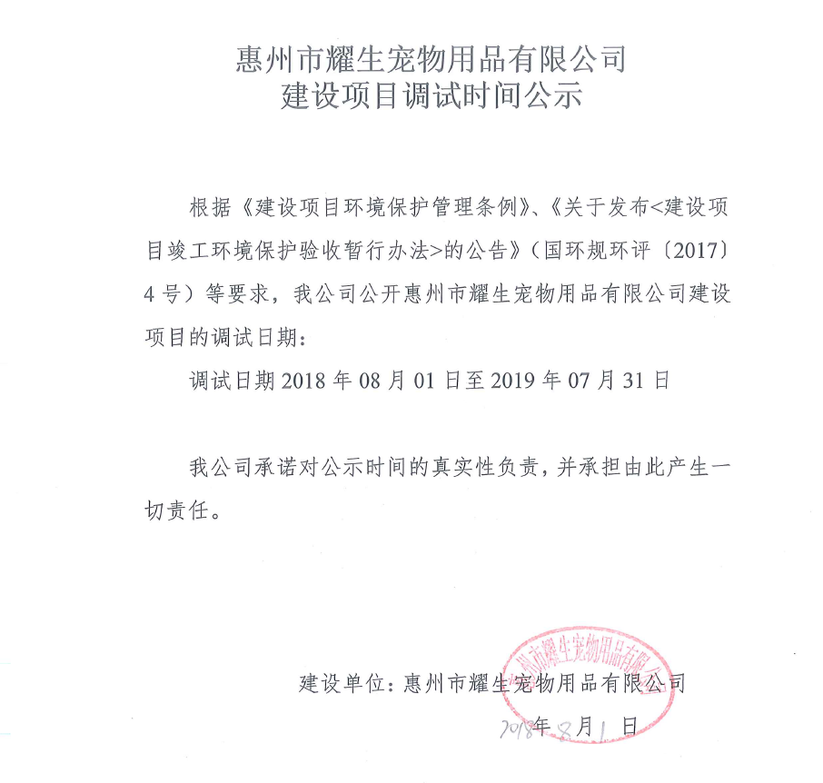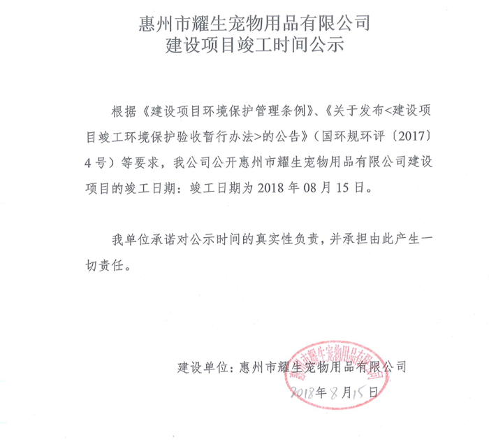 惠州市耀生寵物用品有限公司建設(shè)項目竣工環(huán)境保護(hù)驗(yàn)收報告表公示